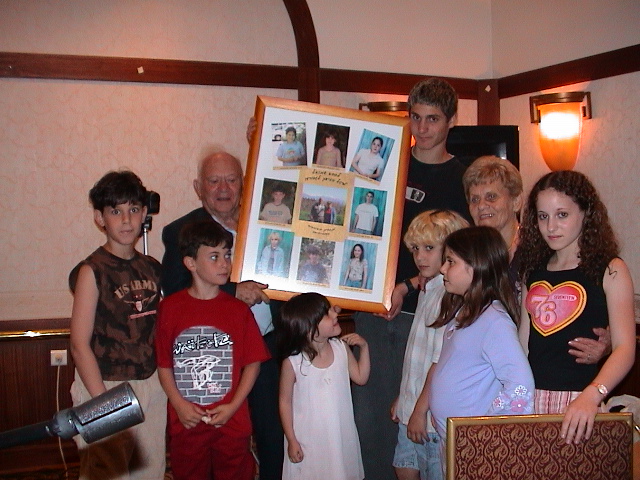 | Shmuel Goldberger's 80th birthday party. Celebrated May 20th, 2003 in Jerusalem, Israel. Front Row (Left to Right): Dolev, Peleg, Meitar, Shai, Eliyah and Maayan Goldberger. Shachar Gilboa (Goldberger). Back Row: Shmuel Goldberger, Tal Gilboa (Goldberger), and Lea Goldberger (wife of Shmuel). |